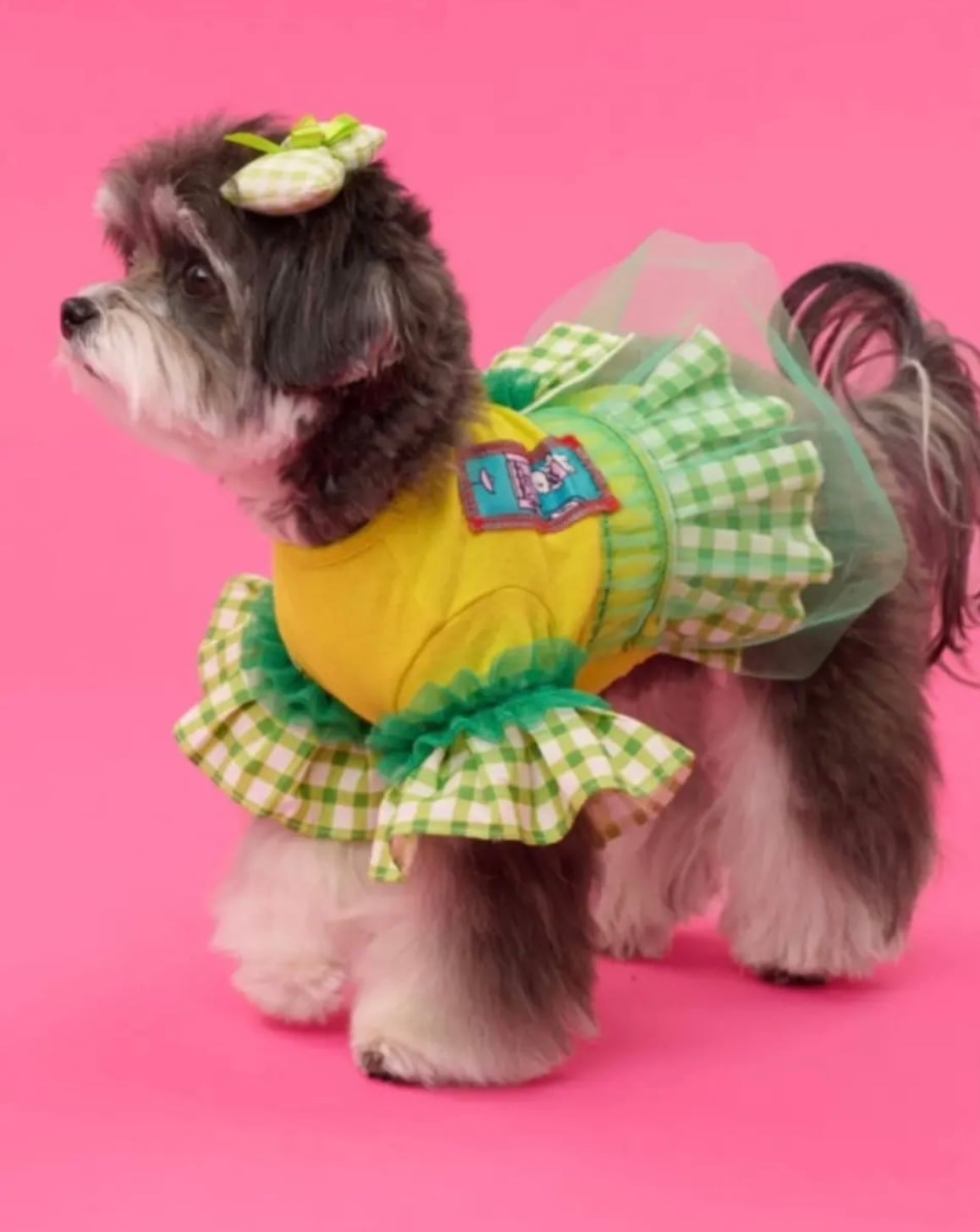 豊かなラッフル袖やスカート、キュートなイラストラベルまで加えられ、愛らしさと
