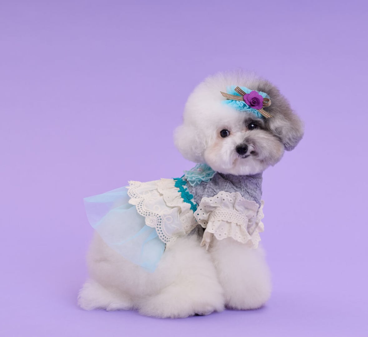 ほのかなラベンダーとグレーの豊かなアイボリーレースを加えて、甘いが端正なムードに